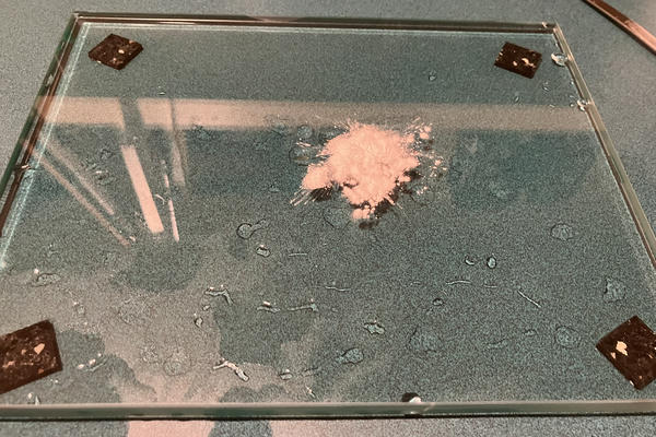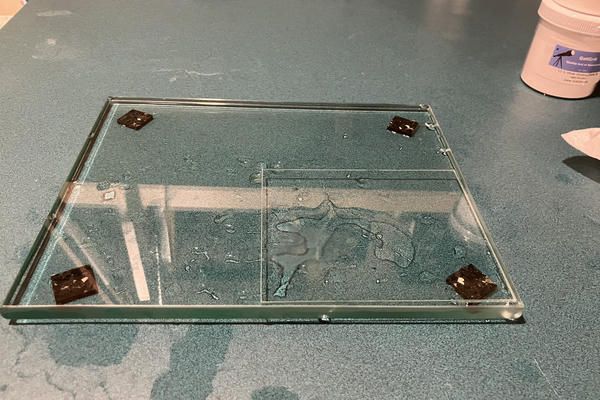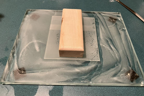 Set the large piece of glass down on the counter, this acts as our "anvil", it's meant to be heavy and flat for us to grind against.