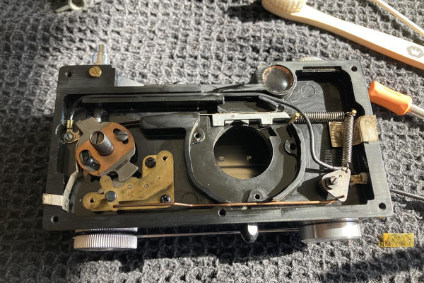 The first issue I wanted to look at was the shutter speeds. When cocked and fired the shutter blades frequently got stuck, a second shot might get them to move, or not. The Argus C3 has a focal plane leaf shutter and is pretty easy to get access to. After opening the front of the camera it only requires three screws to remove the entirea assembly.