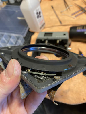 To replace it, start by removing the matte black light trap (it's a black ring around the opening). Below that will be a lever and spring assembly and a steel ring, remove both.