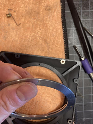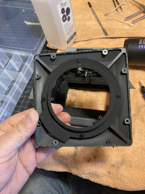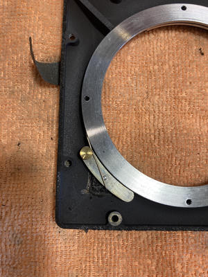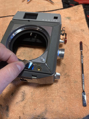 The first step is to remove the four pieces of leatherette that surround the lens mount. Beneath each you will find two brass flat head screws under a half moon of brash sheet metal.
