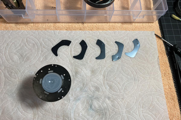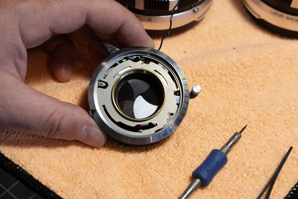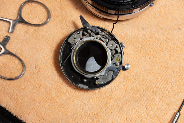I didn't remember to fully document my process for reassembling the various blades, it's tricky. For a shutter this size I like to set the parts on an old film canister and reassemble from there. I use a pair of blunt tipped tweezers to avoid scratching along with a toothpick to help position the blades back into place. The aperture blades will be easy until the last one that needs to slide under the first one, but if you're patient it should work out okay.