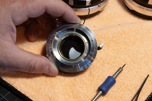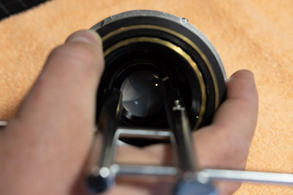 The first step is to remove the shutter from the lens housing. To do this there's a ring on the back that should be removed. I recommend removing the rear cell first as this can often be done easily by hand and makes the subsequent steps easier.