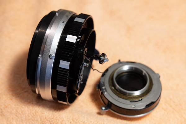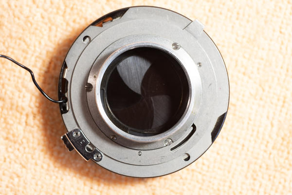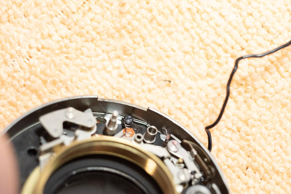 Once that's off, you'll have to slide the shutter off of the lens housing. The flash setting lever is set in a slit that can require some jiggering to get out properly. The PC sync port is attached with a wire, some lenses will have a small slit that allows you to remove the port from the lens, some don't and you'll need to desolder the port from the wire to remove it.