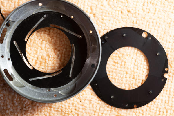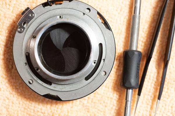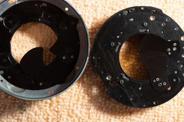 Under the shutter blades will be a plate that holds the aperture blades against the bottom of the shutter housing. Remove the three screws and the aperture blades.