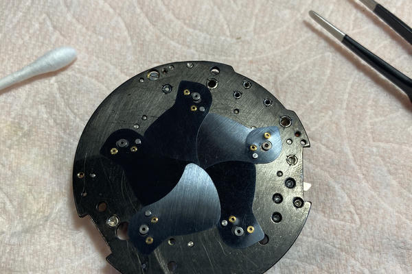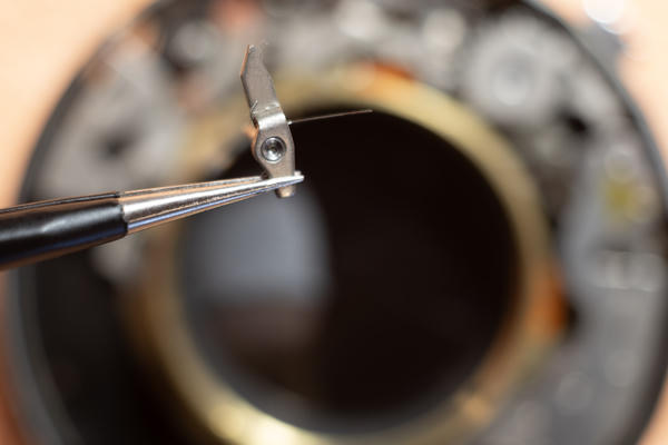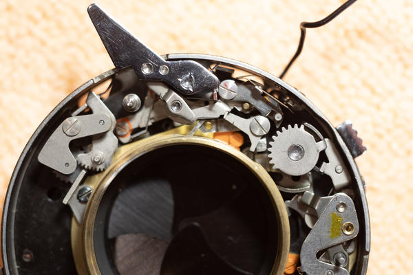 In order for us to clean the aperture and shutter blades we need to remove the plate that holds the various parts from the shutter housing. To do this safely we first need to remove from the plate the parts that have sprints tensioned against the housing. If you don't do that first you risk bending or breaking the springs as well as making reassembly very difficult