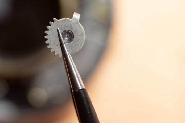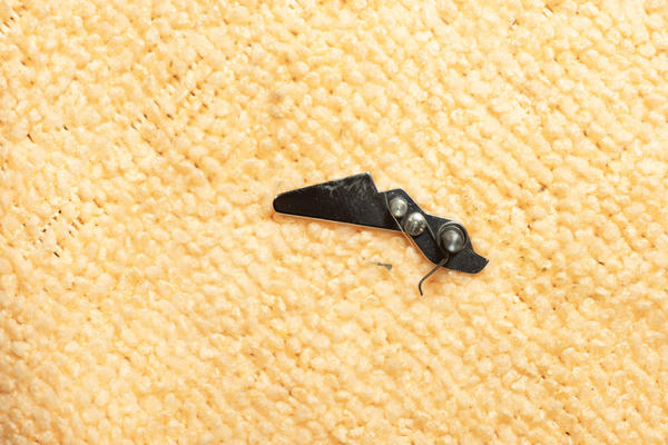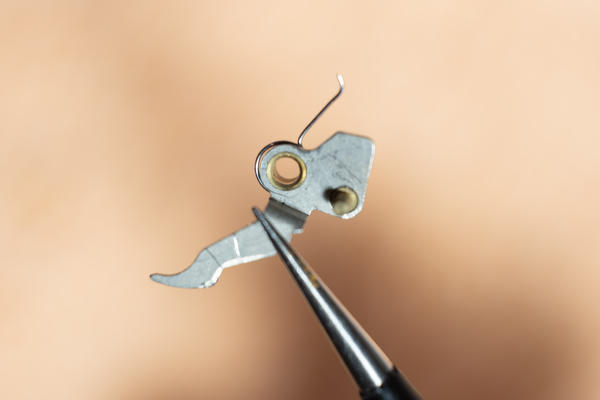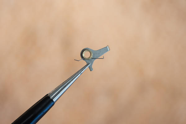 As a warning, this screw is a pain to get back in. The process I've landed on is to first set the detent spring down slightly to the right of where the screw hole is. Then I place the screw with the detent spring attached near that spring further to the right, then I place my tweezers slightly to the left at the edge of the plate, and with a slotted screw driver I position it into the slot while pushing towards the hole to the right. Usually using this method I can tension the springs and manage to hook it into the hole with a couple of tries.